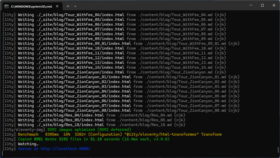 - Re-served via Node.js (CLI: npx @11ty/eleventy –serve) to get all the relevant files for upload. sitemap.xml will be used for Google indexing. Google site ownership verification html is preserved.