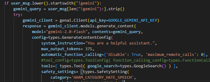 (screenshot from my current work) I disabled the automatic function calling (AFC) (see https://ai.google.dev/gemini-api/docs/function-calling/tutorial), as it was causing unwanted warning messages such as these:
